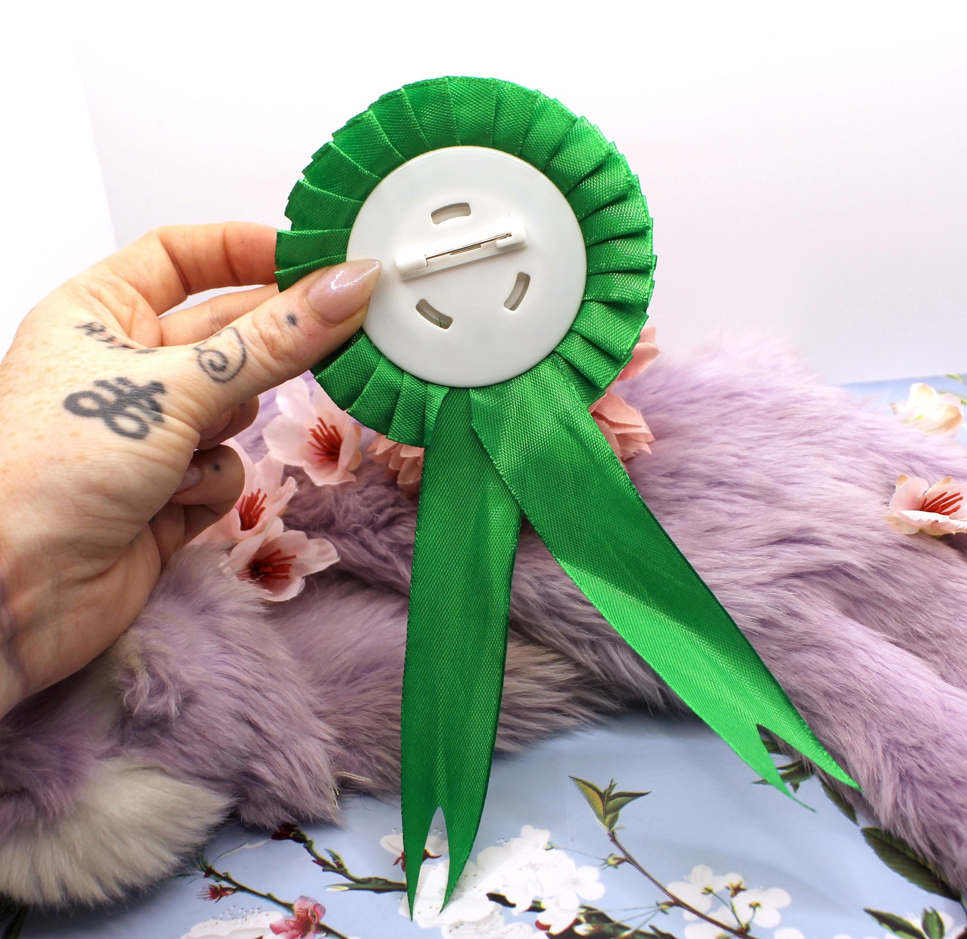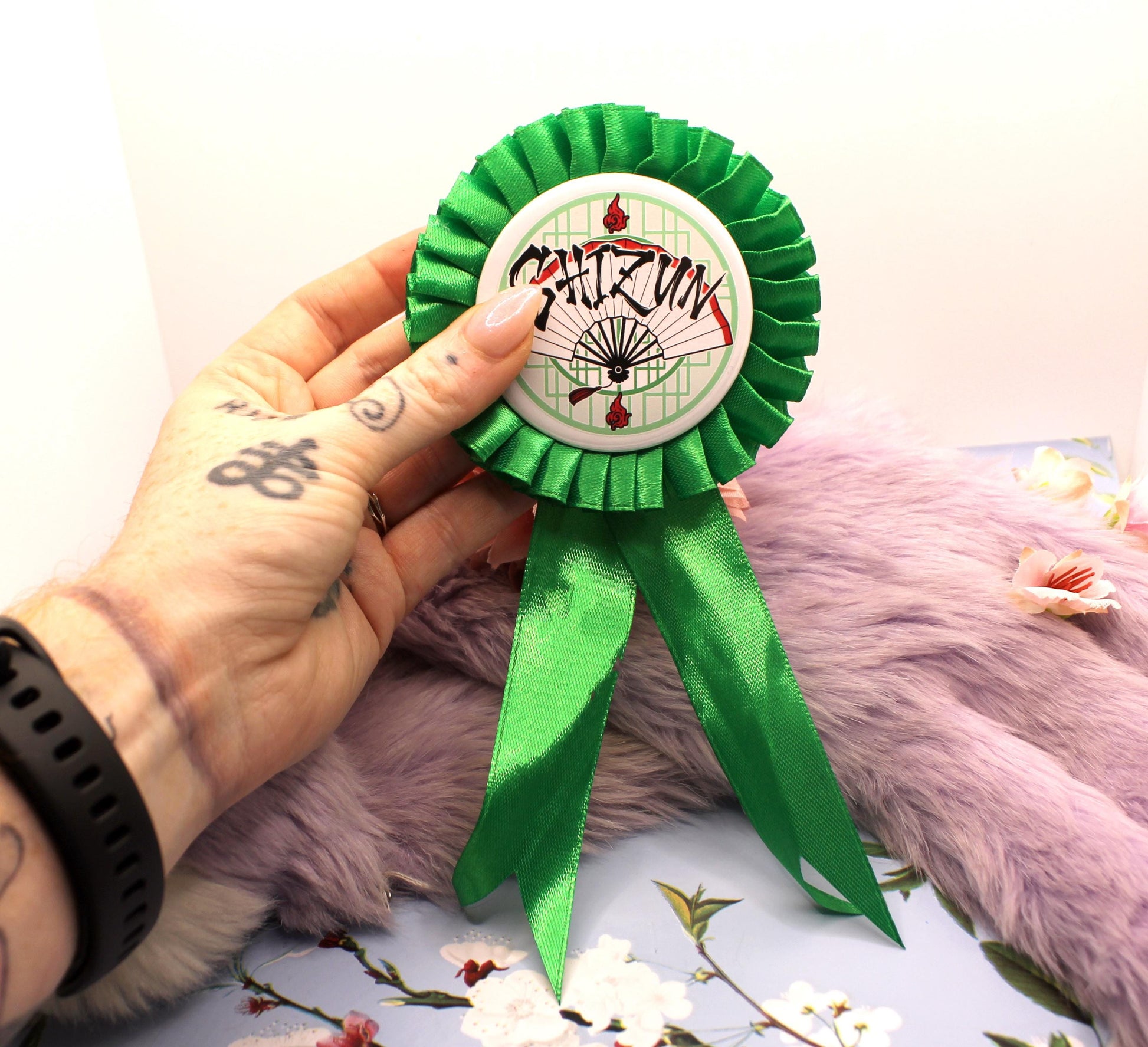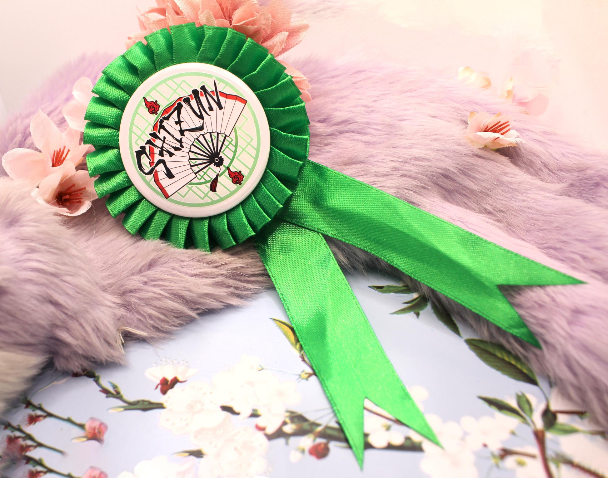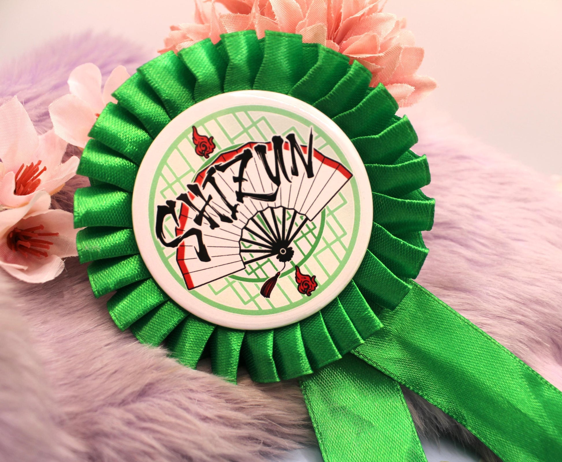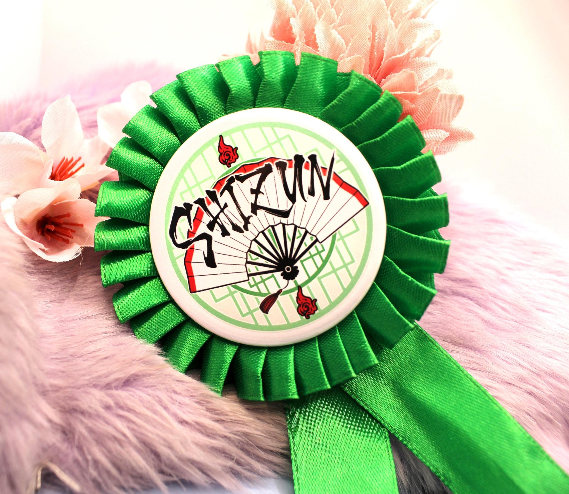 The illustration on the badge shows a green lattice window on a white background, with Shen Qingqiu's folding fan in front of it and the word 'Shizun' across it. In the background is Luo Binghe's forehead sigil, on a green ribbon rosette. The badge itself is 58mm in size with a push-pin back. The full rosette is 9cm x 20cm approx.