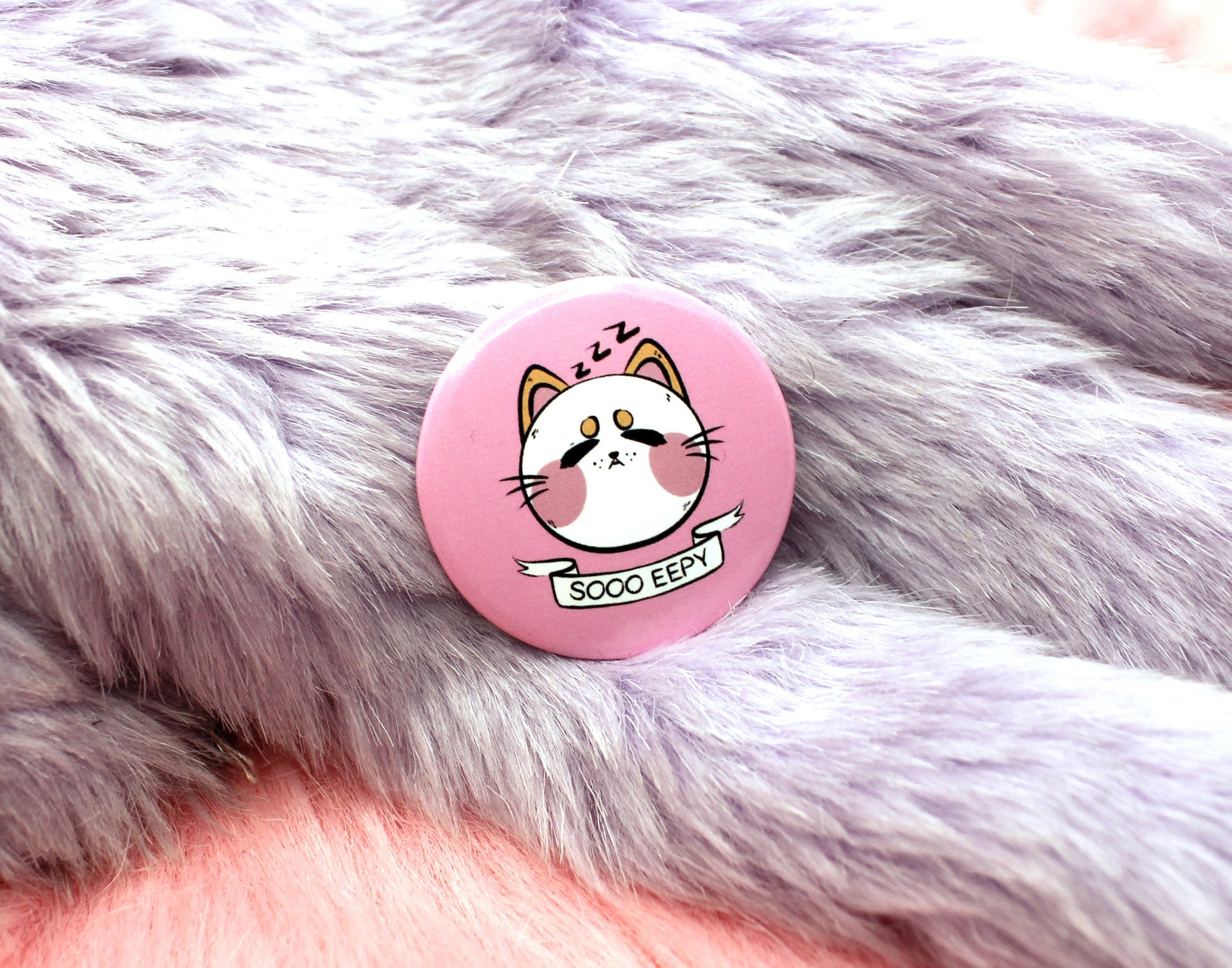 This pastel cartoon cat head is sooooo eepy, it is 38mm in size and comes with a push pin back.
