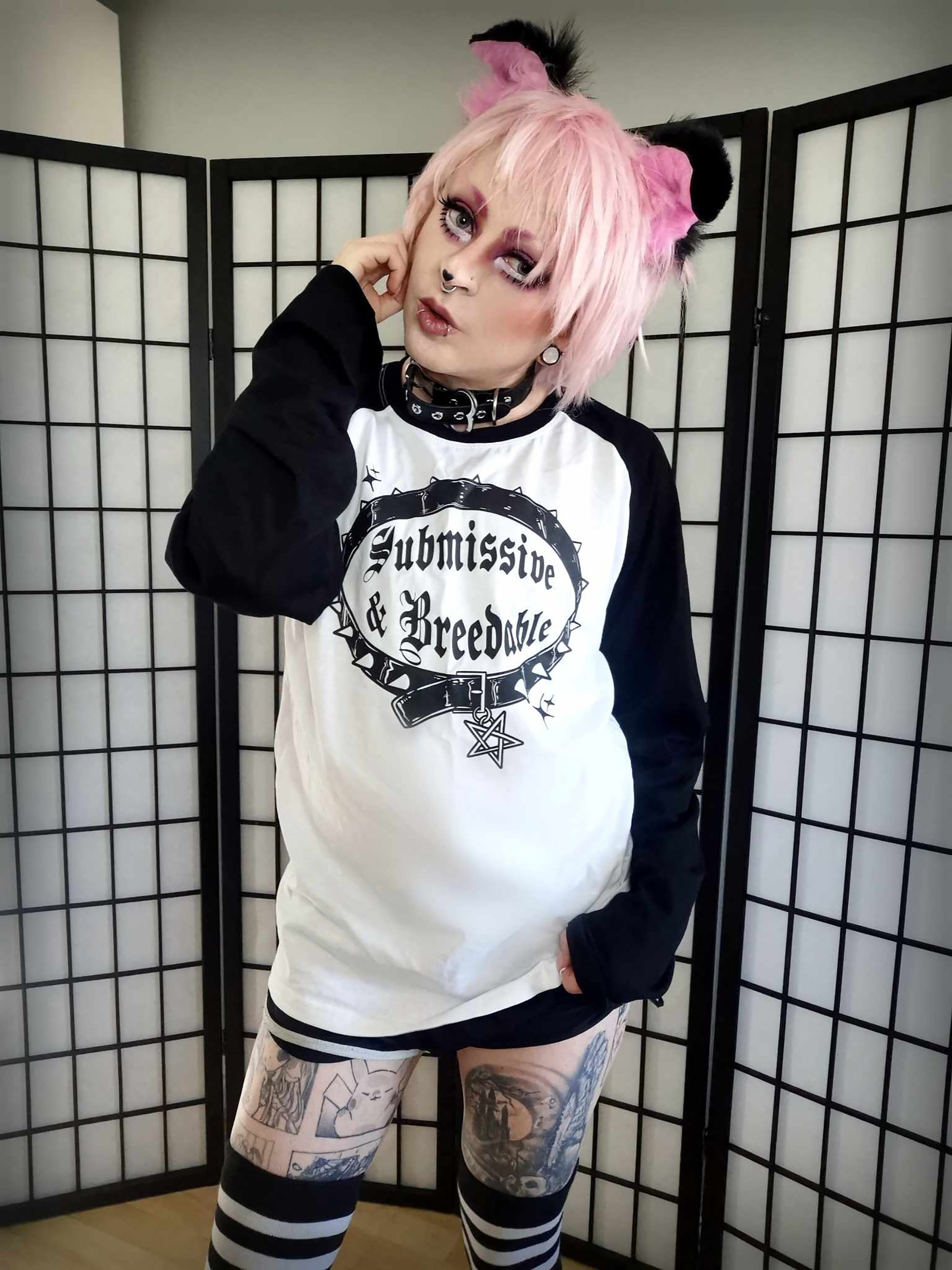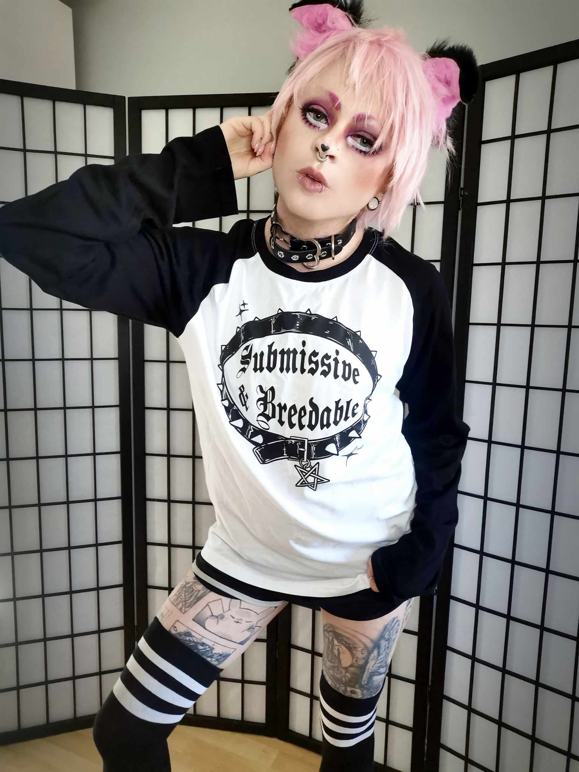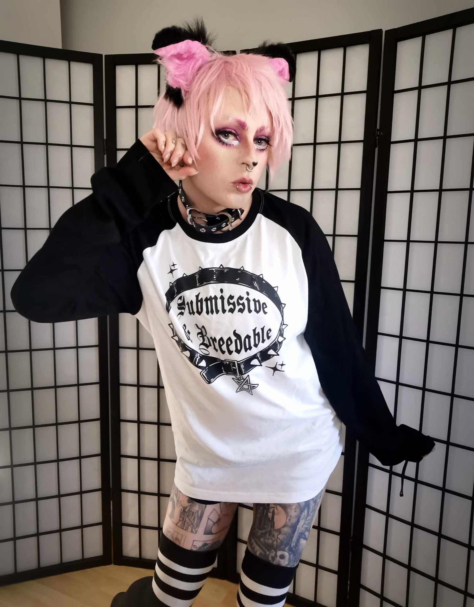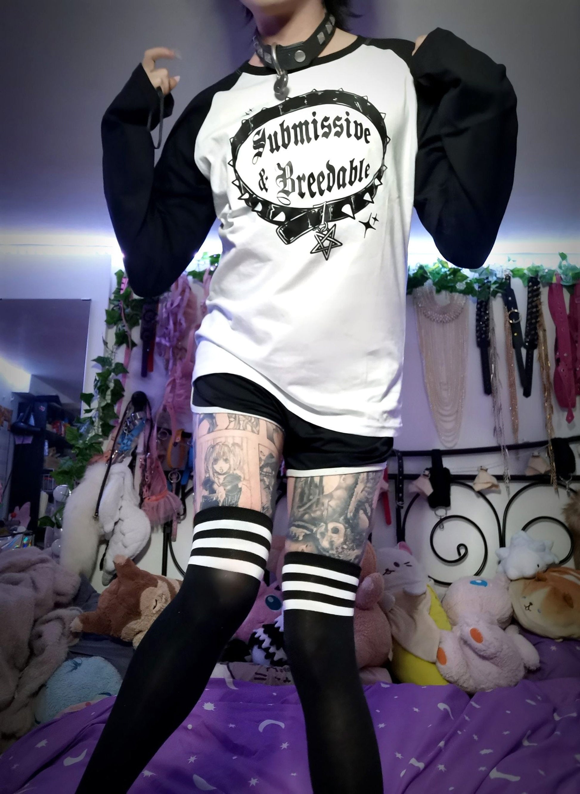 These base-ball tees have extra long sleeves for an additional 'submissive & breedable' aesthetic. They are a poly-cotton blend so have a small amount of elasticity and are comfortable, breathable and lightweight to wear.