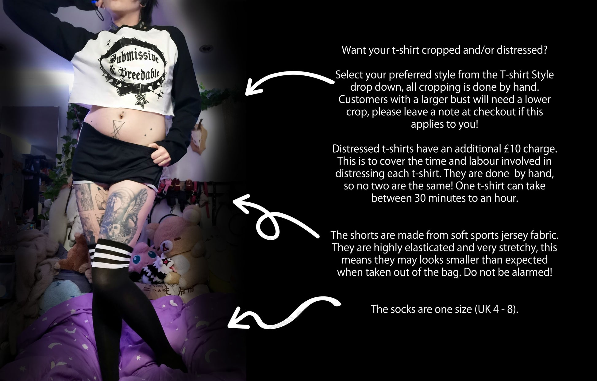The Full Outfit includes: Long Sleeve T-shirt (cropped or standard length), shorts and socks.