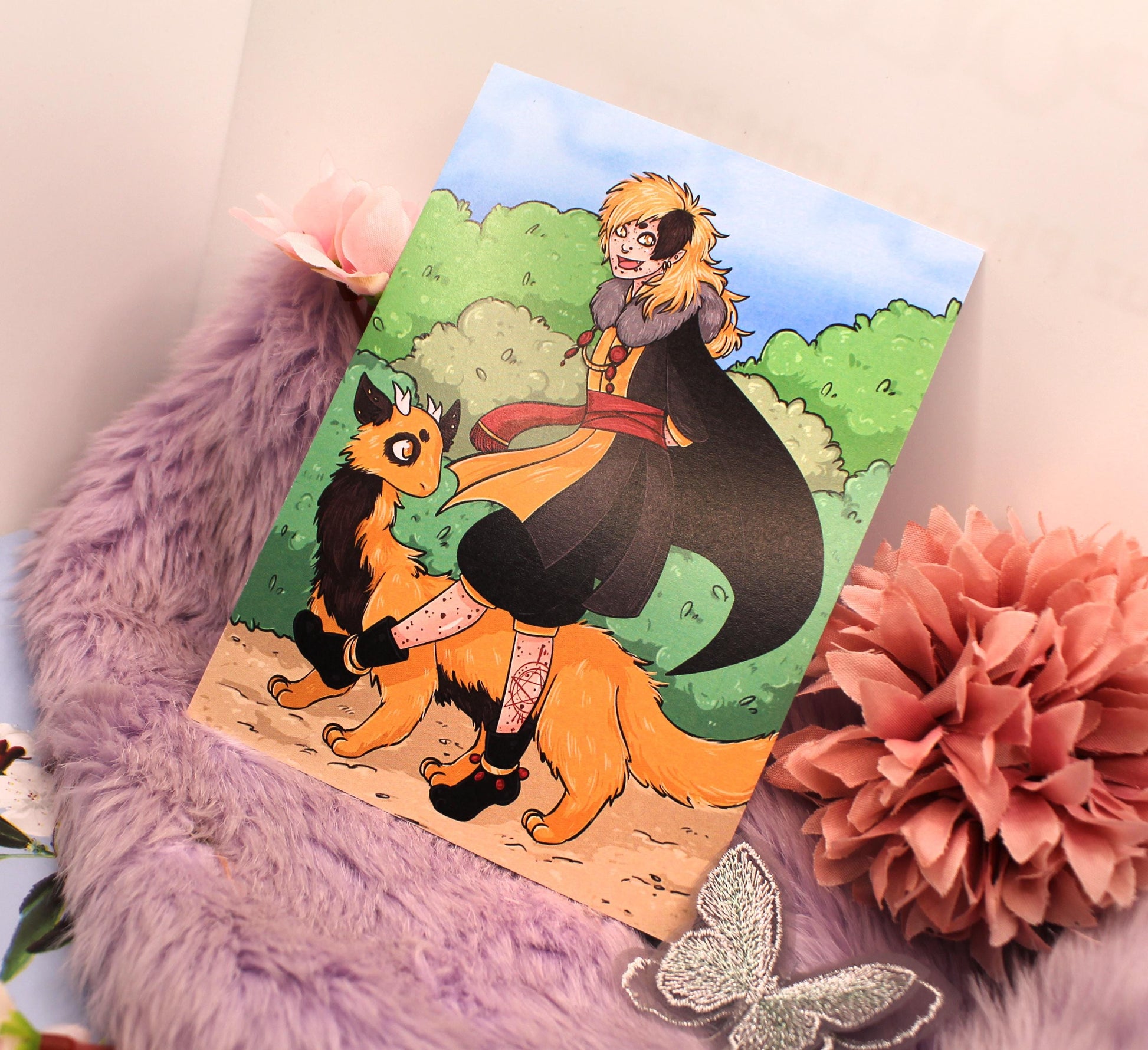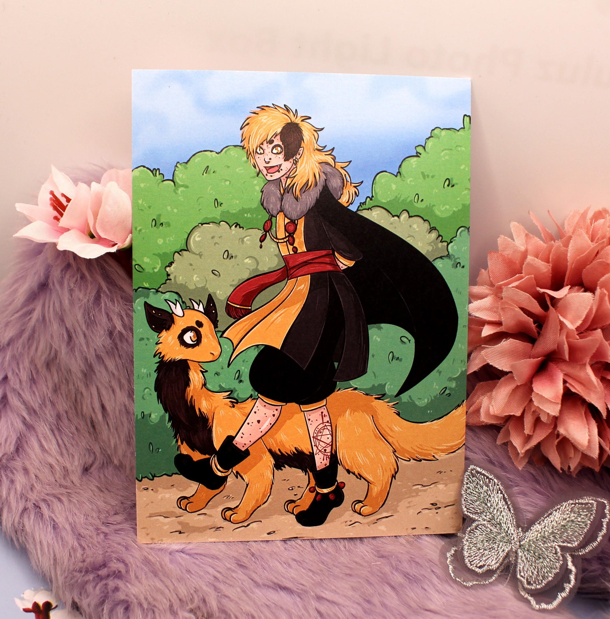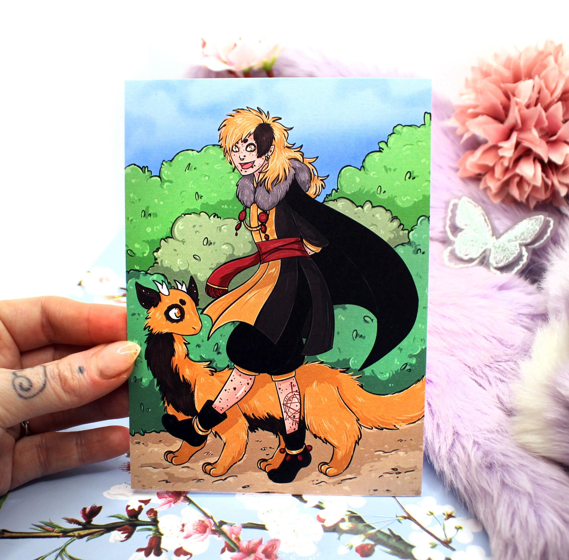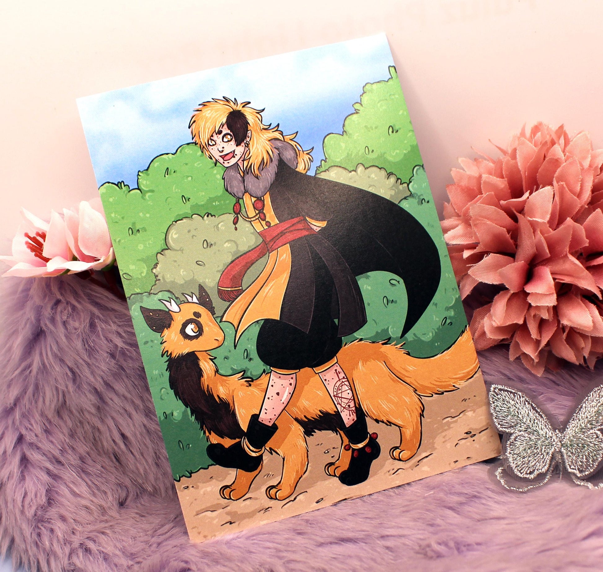 This Nightingale Dragon themed print is A6 in size, the image on it depicts a scene of Taowren (a blonde haired twink) walking in the countryside, accompanied by his golden dragon, Ettore. The artwork is full colour, drawn in a modern cartoon style.