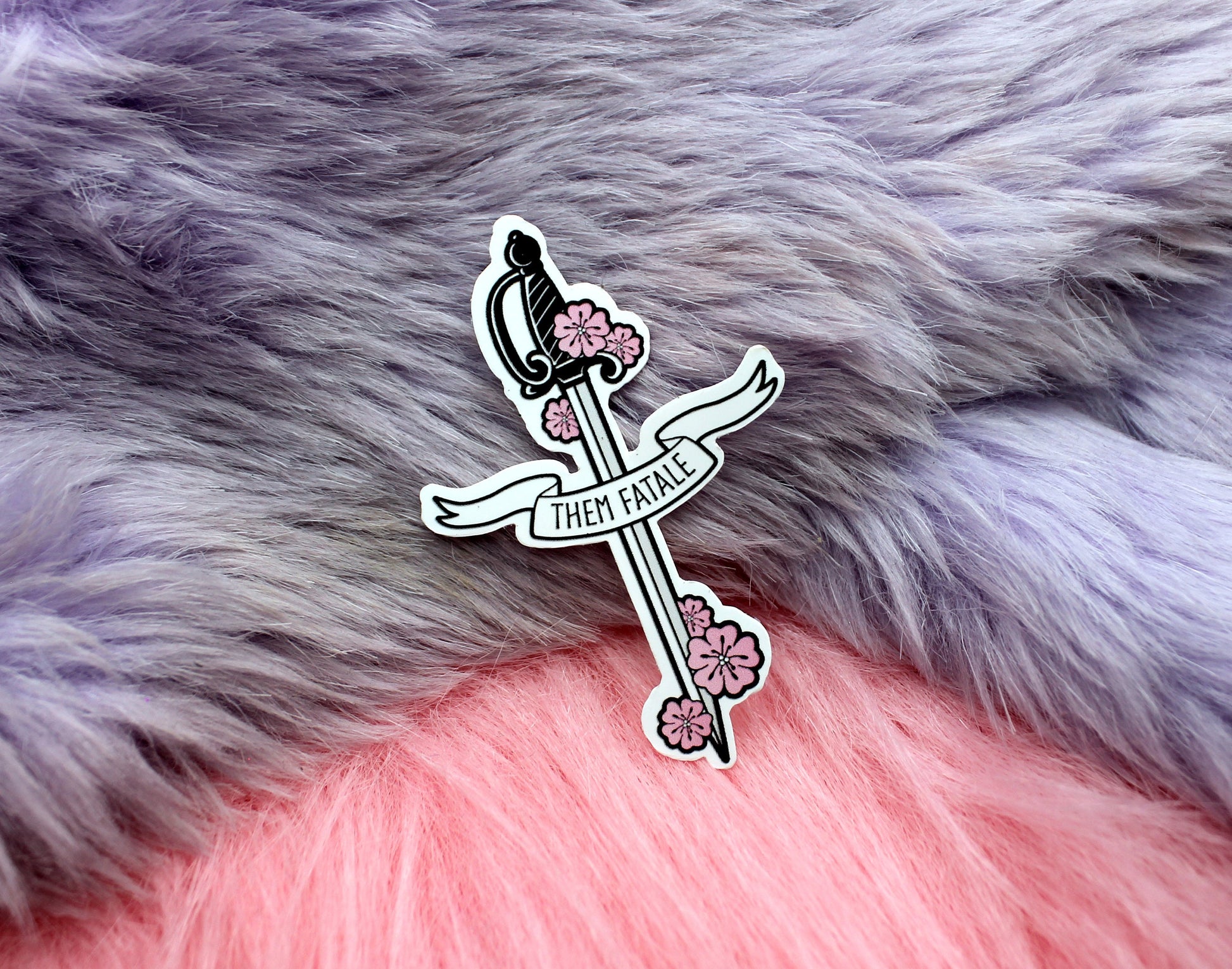 For my powerful non-binary friends, Them Fatale is a play on 'Femme Fatale' but with a less binary edge. Sword and flowers included with the banner for that good aesthetic.