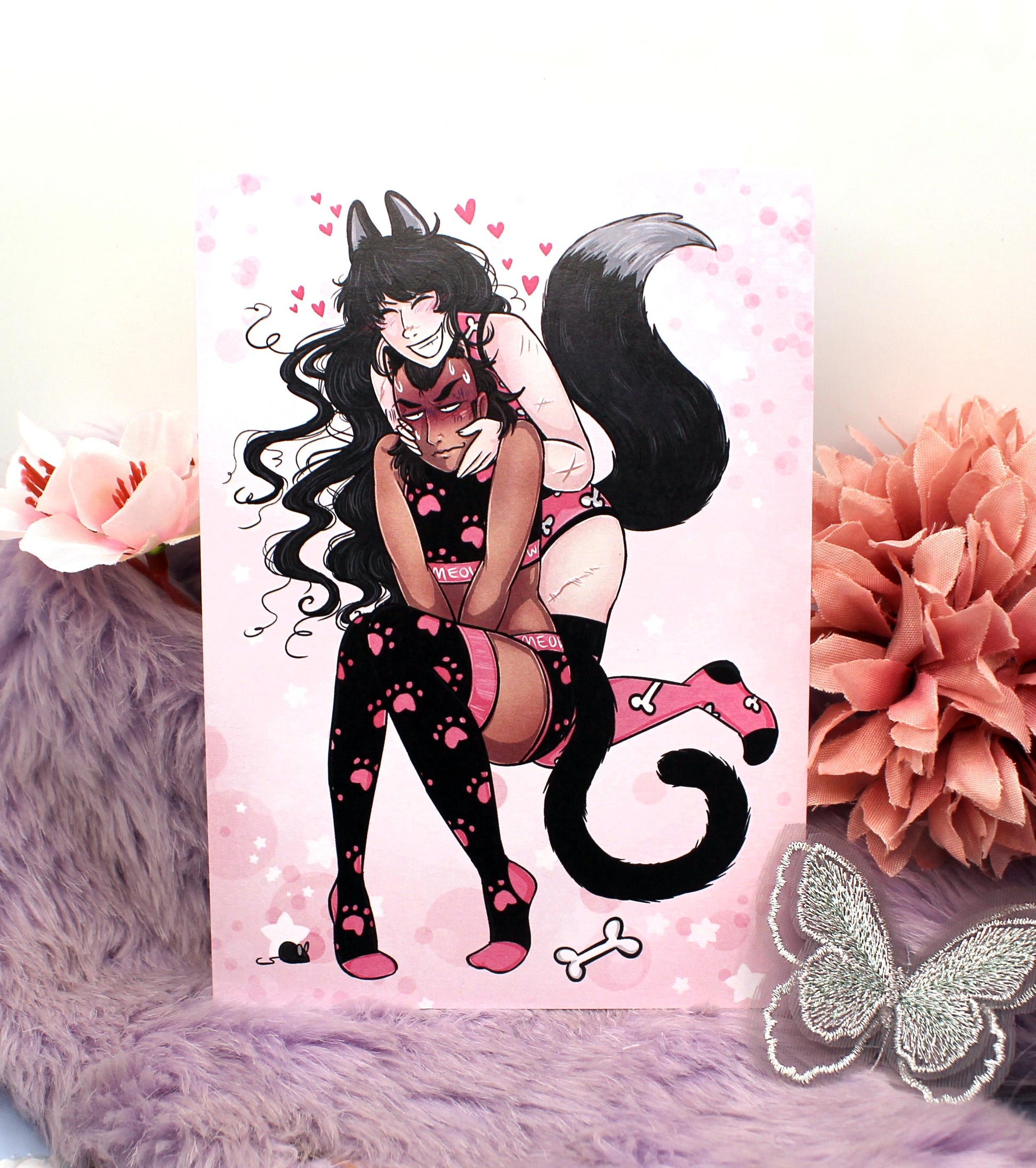 This print is A6 in size, and depicts two original characters: Tomar and Ginzin. Tomar is dressed in an Occult Trash 'Meow Meow' lingerie set, which includes a paw print patterned crop top, shorts and thigh high socks. He looks embarrassed, whilst being hugged from behind by Ginzin. Ginzin is depicted in the pink version of the Occult Trash 'Woof Woof' set, a lingerie set patterned with dog bones.