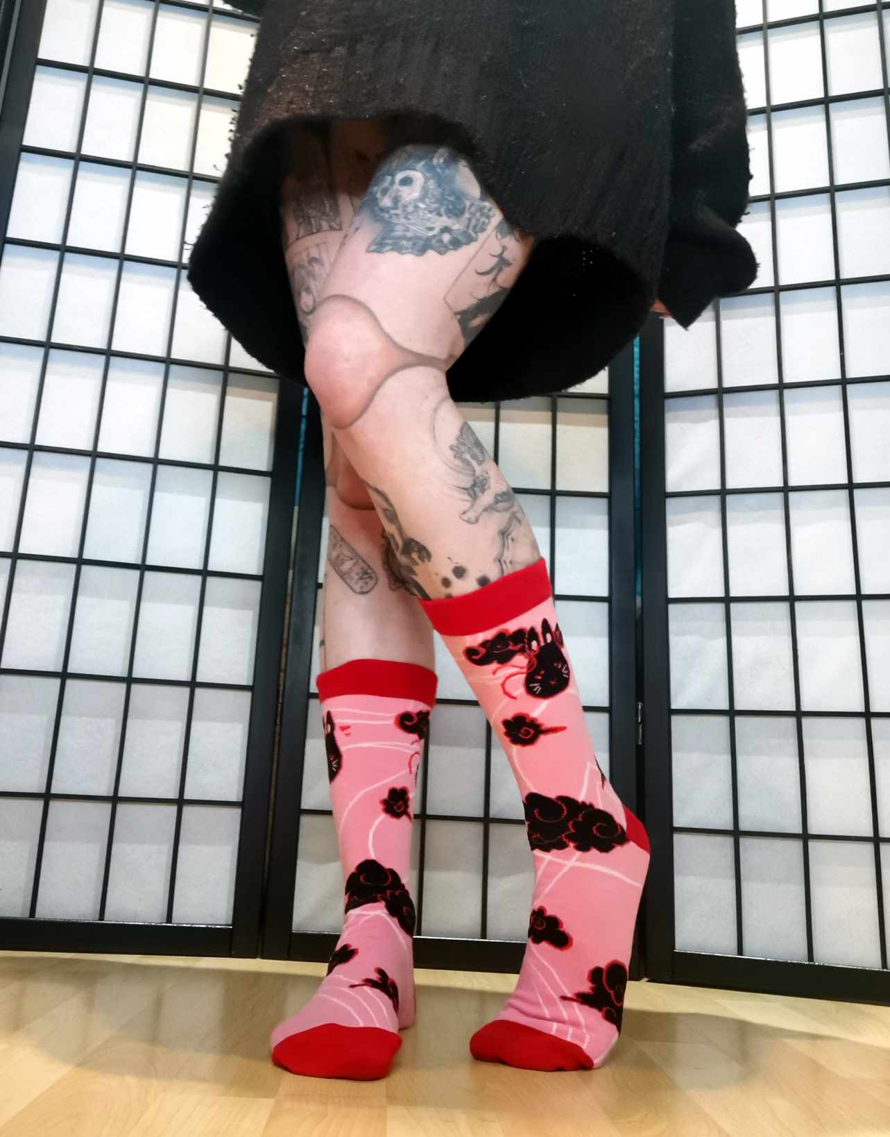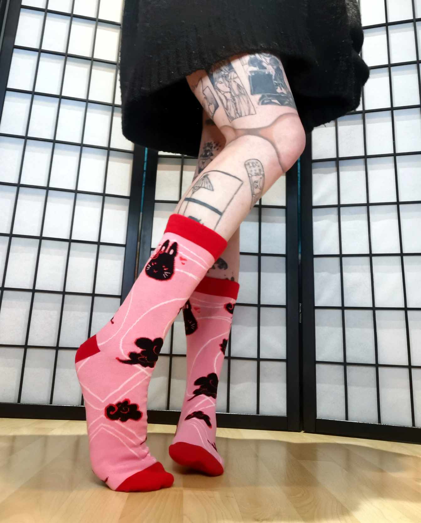 Wei Wuxian rabbit pink, red and black mid-calf length socks inspired by the character from "The Untamed" or "Mo Dao Zu Shi."